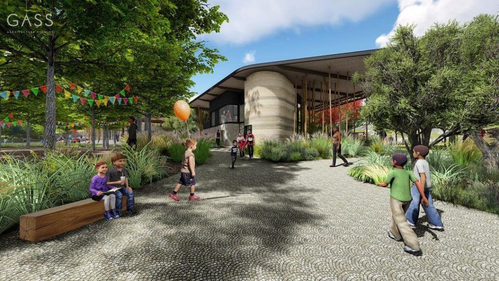 Das Wasser für die Schule wird aus dem Fluss entnommen und das Bohrloch wird durch Regenwasser aufgefüllt. Die kohlenstoff- und wasserneutrale Schule wird mehr Energie produzieren als sie verbraucht.
