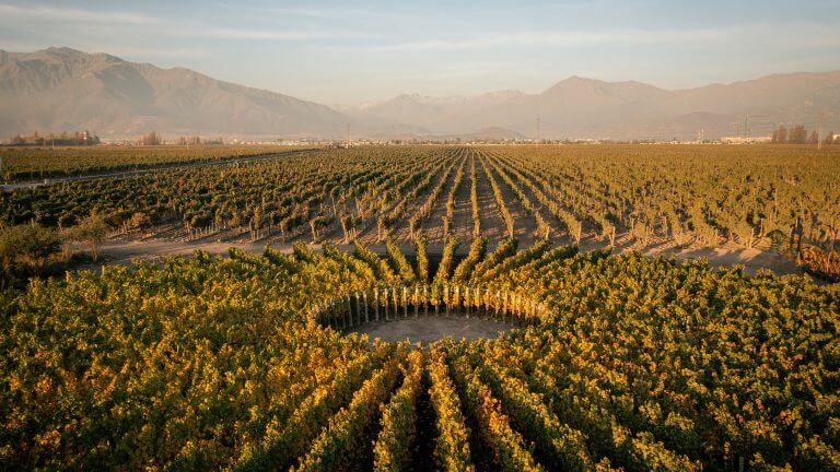 Weinberge, wie Städte, sind oft in leicht zu navigierenden Gittern angelegt. Einfache Reihen machen den Anbau einfacher und praktischer. Vielleicht einfacher für Menschen, aber ist es optimal für die Trauben? Zwei gewagte Experimente testen diese Frage in Echtzeit. In Viña Don Melchor in Chiles Appellation Puente Alto pflanzte der CEO und technische Direktor Enrique Tirado einen 0,4 Hektar großen Versuchsweinberg mit 60 15 Meter langen Rebenreihen, um zu sehen, wie sich Weinberge mit radialer Ausrichtung auf die Entwicklung und Reifung der Trauben auswirken. „Wir erforschen, wie die Reihenorientierung und Pflanzdichte die mikroklimatischen Bedingungen auf Traubenebene beeinflussen und wie sich das auf die Qualität des Endweins auswirkt“, sagt Tirado. „Wir untersuchen Temperatur, Sonneneinstrahlung, den Grad der Photosynthese sowie die Qualität und Konzentration verschiedener Elemente. All diese Faktoren spielen eine wichtige Rolle bei der Produktion und Reifung von phenolischen Verbindungen in den Trauben, einschließlich Zucker, pH-Wert und Säuregehalt.“ Tirado sagt, diese experimentelle Studie sei der nächste logische Schritt für die 310 Hektar Reben von Don Melchor. Im Jahr 1997 wurde der Weinberg entsprechend dem Boden in 151 Parzellen unterteilt, wobei jede Parzelle entsprechend ihren spezifischen klimatischen Bedürfnissen separat bewirtschaftet und vinifiziert wurde. „Unser erster Schritt bestand darin, die verschiedenen Parzellen zu schaffen und zu lernen, wie man jede einzelne in wärmeren und kühleren Jahren bewirtschaftet“, sagt Tirado. „Mit dem Sonnenuhr-Weinberg wollen wir herausfinden, wie das Mikroklima der Reben durch Reihenorientierung und Dichte verändert werden kann.“