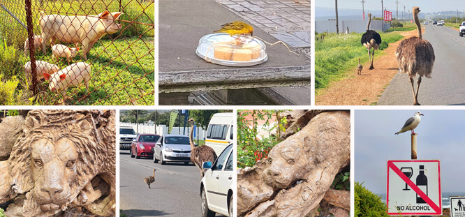 Doch von den Schnitzarbeiten zurück zu unseren tierischen Begegnungen, die angefangen von einer Straußenfamilie mit einem stolzen Küken, das den gesamten Verkehr lahmlegte, und einer für uns eher geschäftsschädigenden Möwe, die frech zur Abstinenz aufruft, über Käsekuchen attackierende Webervögel bis hin zu einer gänzlich unerwarteten Schweinefamilie reichten.