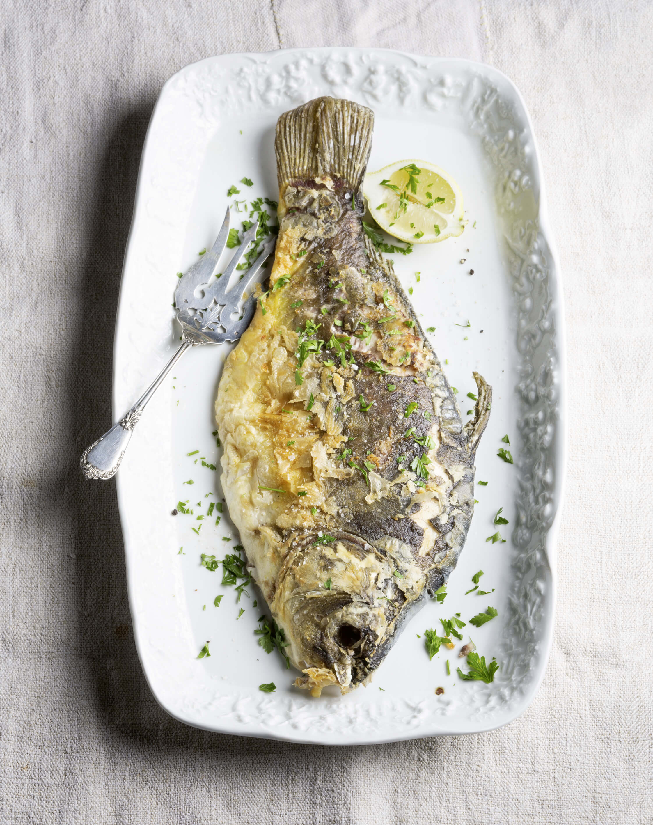 gebackenen Fische im Backofen warm halten. Den gebackenen Karpfen mit Zitronenspalten servieren.