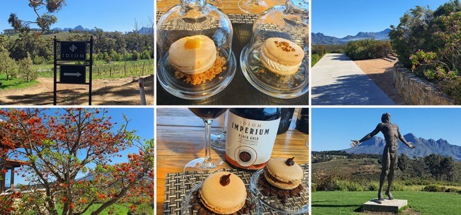 Nach einem der wohl nassesten und gefühlt längsten Winter am Kap, geprägt von Unwettern, Kältewellen, heftigen Fluten und Überschwemmungen, machten wir uns am ersten Morgen unserer Wine Pairing Tour bei strahlendem Kaiserwetter und guter Laune auf zu unserem ersten Ziel - Idiom Wines in Somerset West. Idiom bot uns spektakuläre Ausblicke auf die majestätischen Berge der Helderberg-Region und das gesamte Profil der Kaphalbinsel, vom Tafelberg bis hin zum Cape Point, und bereits die Auffahrt zum Estate war an diesem bilderbuchhaften Frühlingsmorgen eine wahre Wonne. Hier waren wir für unser Macaron & Wine Pairing angemeldet, das jedoch ohne eine entsprechende Unterlage, bzw. einem guten Frühstück, erst einmal noch warten musste (übrigens bitte nicht wundern, im Kapweinland haben wir eigene Regeln was eine akzeptable Zeit fürs Weintrinken betrifft – hier ist immer Wine o’clock ?). So starteten wir direkt nach unserem Frühstück mit Prosecco und Merlot, gepaart mit einer Variation an zauberhaft angerichteten Macarons. Ohne den Rahmen dieses Newsletters sprengen zu wollen, müssen wir hier einfach näher ins Detail gehen. Wir starteten mit einem Prosecco, der mit einem mit Pfirsich-Butter-Creme gefüllten Karamell-Macaron kombiniert wurde – pure Finesse und Eleganz, wie von einem feinen Hochzeitsmenu, bei der die ausgeprägten Pfirsicharomen des Macarons die Steinfrucht-Aromatik des Proseccos zum Glänzen brachte. Im Anschluss folgte ein Zitronen-Macaron mit Karamell-Füllung, der die zarten Zitrus- und Grapefruit-Aromen des zweiten Proseccos auf wundervolle Weise intensivierte, sowie ein Kaffee-Macaron mit dunkler Schokoladenfüllung, der mit einem besonderen Merlot der Kellerei, dem Idiom Hailstorm Merlot kombiniert wurde. Dieser Merlot, der aufgrund heftigen Hagels auf den Reben gelassen werden musste, wurde in Form getrockneter Rosinen gelesen und vinifiziert und setzte mit seiner leicht rosinenartigen Aromatik und einem leicht erhöhten Alkoholgehalt (dabei jedoch nicht süß) in Kombination mit besagtem Macaron ein wahres Feuerwerk an Mokka- und Espressoaromen am Gaumen frei. Unser erstes Wine Pairing war ein voller Erfolg, wir waren im „Wine-Pairing-Himmel“.