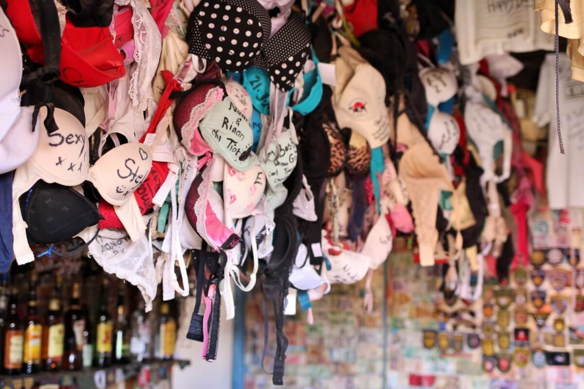 Ronnie hat aus dem Örtchen einen Pilgerort gemacht, mit allerhand Tand, Souvenirs aus aller Welt und hier das entscheidende, von der Decke hängen hunderte signierte Dessous.